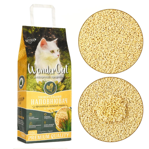 Кукурудзяний наповнювач для котів WonderCat 4,4 кг – екологічний, грудкуючий, зі запахом скошеної трави (4820282190147)