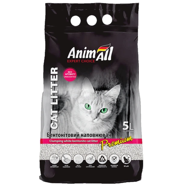 Бентонітовий наповнювач AnimAll Premium Classic без аромату, для котячого туалету, 5 л