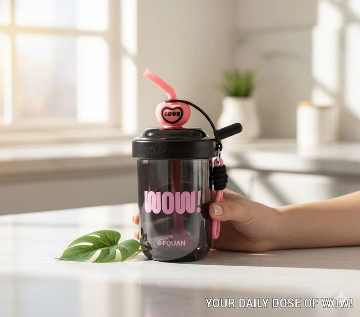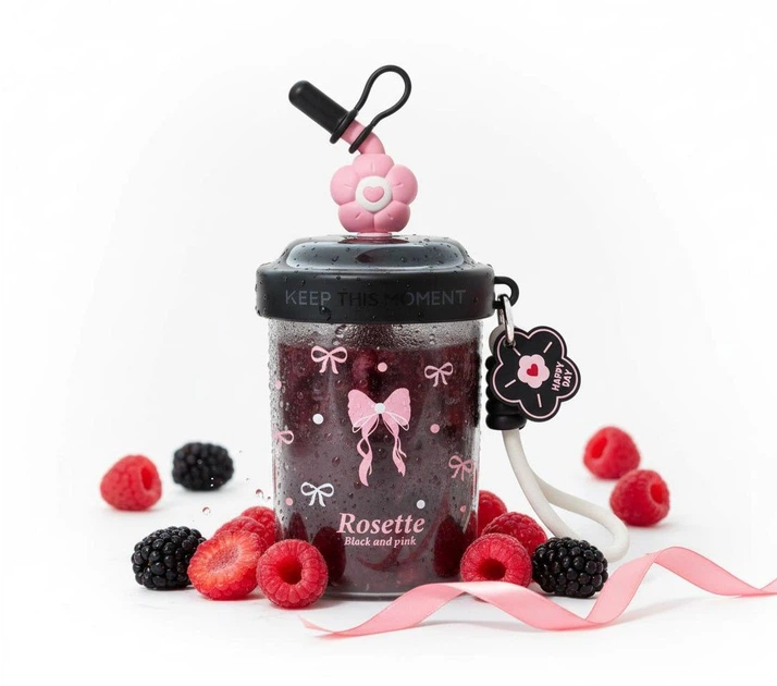 Шейкер рожеві бантики 580 мл з віночком та трубочкою для фітнесу та коктейлів чорний