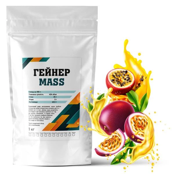 Гейнер вуглеводно-білковий Гадяч MASS 65,5 вуглеводів 1 кг висококалорійний Маракуйя (14-125-G-m1)