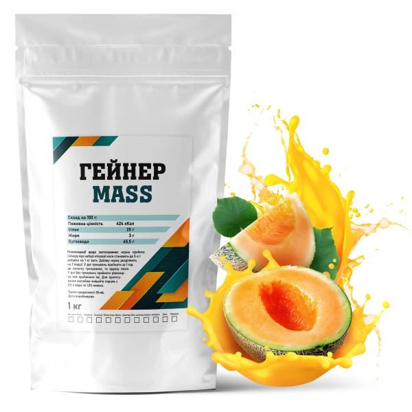 Гейнер вуглеводно-білковий Гадяч MASS 65,5 вуглеводів 1 кг висококалорійний Диня (14-125-G-d1)