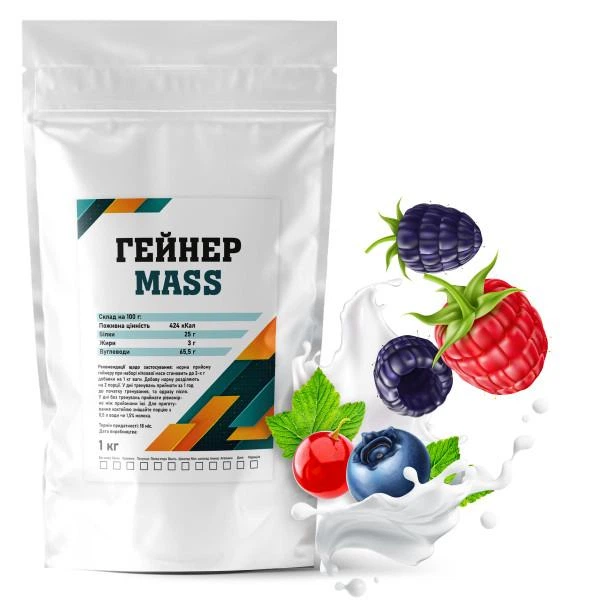 Гейнер вуглеводно-білковий Гадяч MASS 65,5 вуглеводів 1 кг висококалорійний Лісова ягода (14-125-G-1)