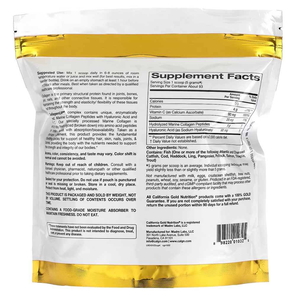 California Gold Nutrition CollagenUP містить морські пептиди колагену, гіалуронову кислоту нетваринного походження та вітамін C. Колаген, гіалуронова кислота та вітамін С пов'язані зі здоров'ям та благополуччям опорно-рухового апарату. - Колаген - це основний структурний білок, що виявляється у всьому організмі і забезпечує важливу інфраструктуру як усередині, так і зовні.< li>Гіалуронова