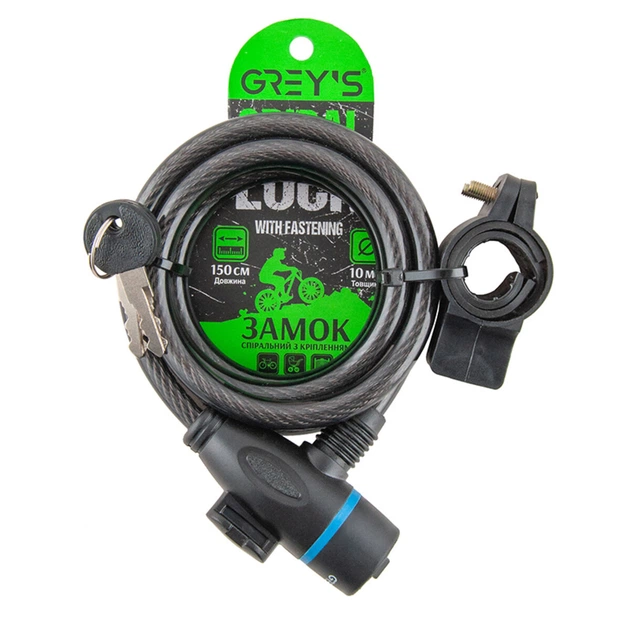 Велозамок Grey's спіральний з кріпленням 10*1500мм GR51015