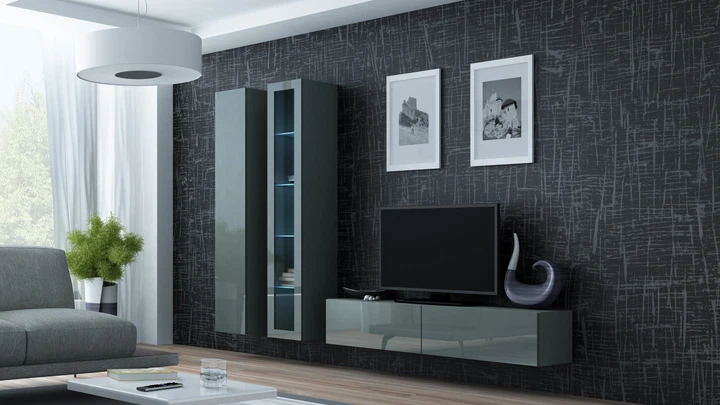 Стінка у вітальню, в зал з вітриною Cama Vigo 10 180x220x42 Сірий мат/Сірий глянець