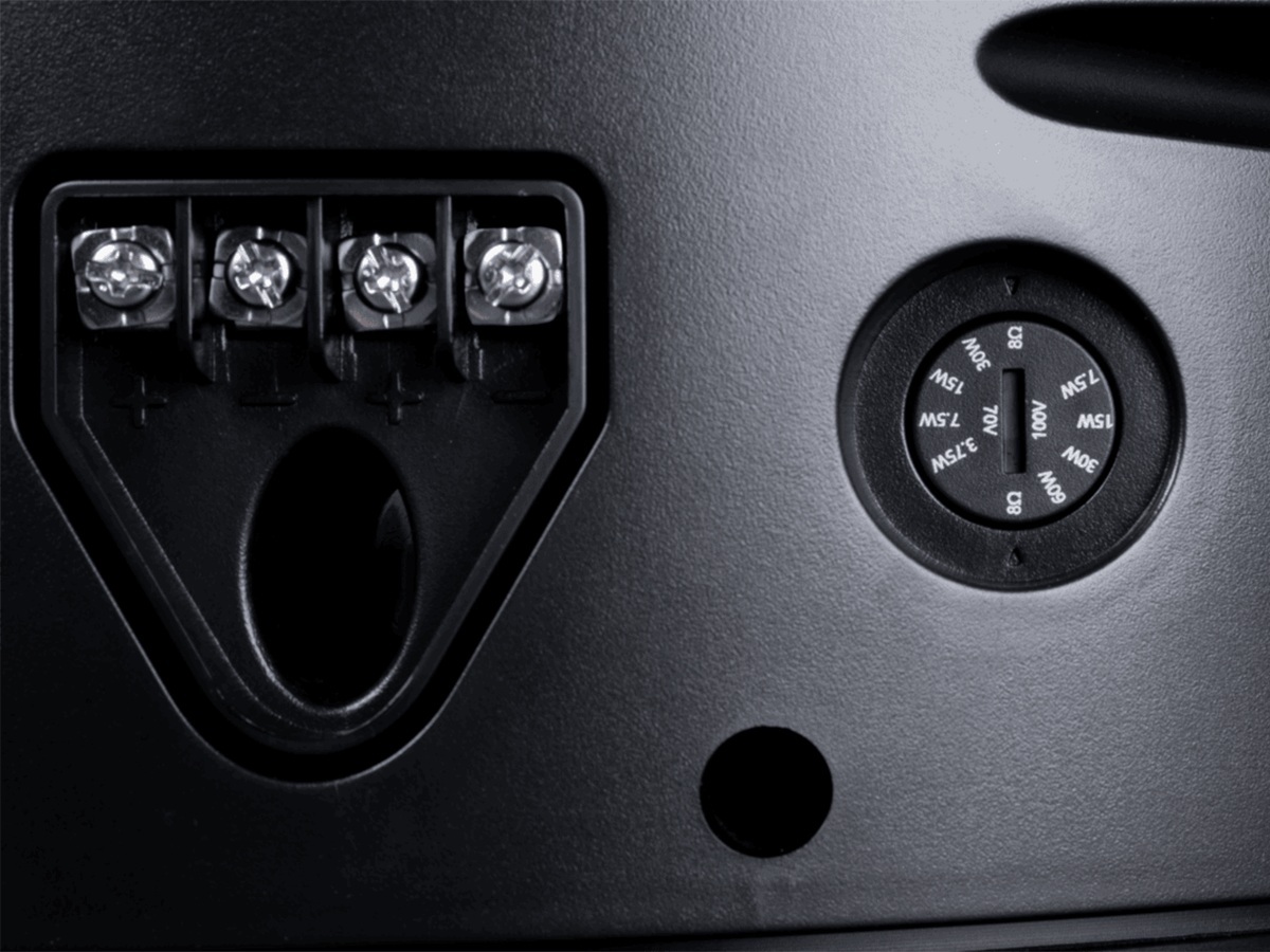 Настінний гучномовець; двосмуговий, 4-дюймовий низькочастотний динамік і 1-дюймовий високочастотний динамік, номінальна вихідна потужність 2.5-5-10-20 Вт, 8 Ом; лінійний вхід 100 В/70 В; діапазон частот 100-20000 Гц; матеріал ABS-пластик та металева решітка; розміри 220 / 162 / 145 мм; вага 2.2 кг; кронштейн для встановлення у комплекті