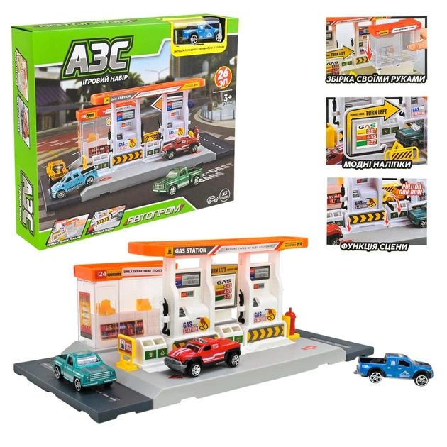 Ігрова заправка для машинок Автопром 26 елементів, 3 авто, наклейки, рухомі деталі PS005-1