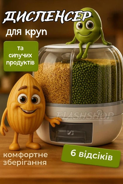 Повротний диспенсер для сипучих продуктів, на 6 відділень / Обертовий органайзер для круп із дозатором