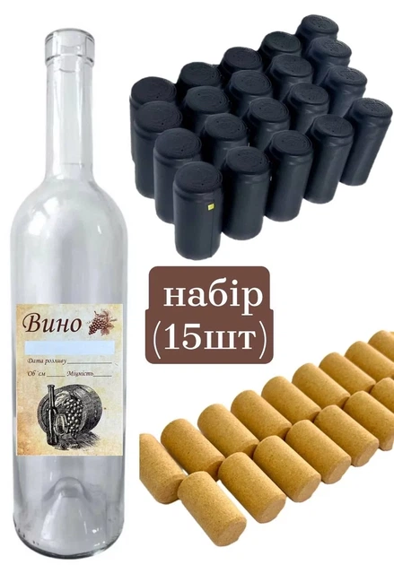 Термоковпачок чорний з пляшкою винною 750 мл прозорою + корковою пробкою 23,5x44 мікроагломерованою + наклейкою "Вино" 15 шт