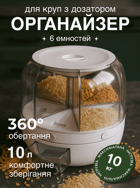Органайзер з контейнерами для круп 6 ємностей для сипучих з дозатором GTM Bulk Обертовий на 360° диспенсер кухонний на 10 л