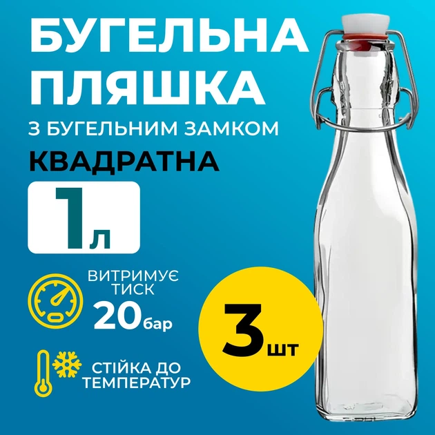 Пляшка Бугельна із замком 1 л (квадратна) прозора 3шт