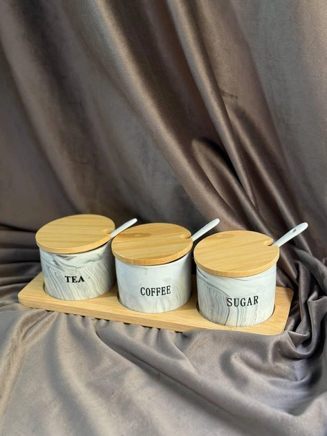 Набір банок для сипучих продуктів Yiwu SCT-660 порцелянових на бамбуковій підставці 3 шт 180 мл Білий мармур