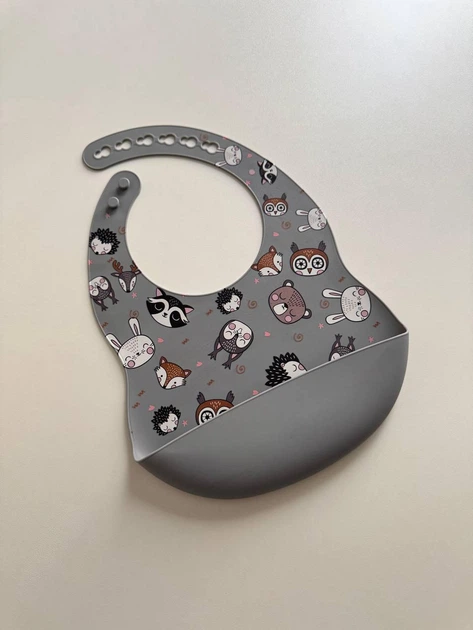 Силіконовий слюнявчик з принтом, дитячий силіконовий нагрудник Звірята Темно сірий