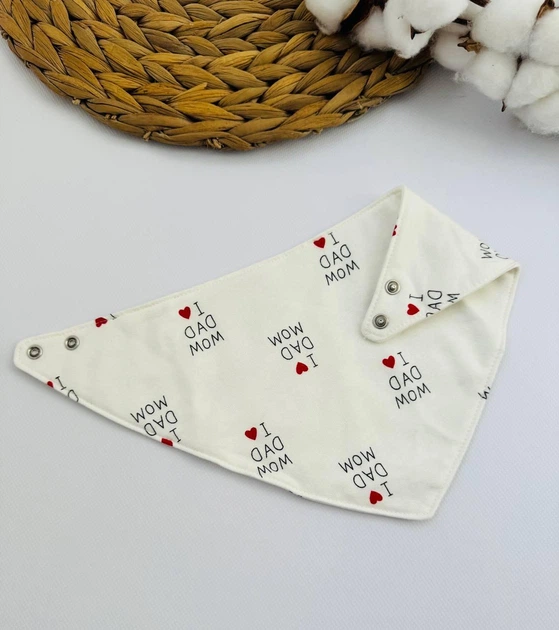Непромокальний двосторонній нагрудники-слинявчик на кнопках з бавовни молочний з малюнком I love mom and dad 40х25х25 см