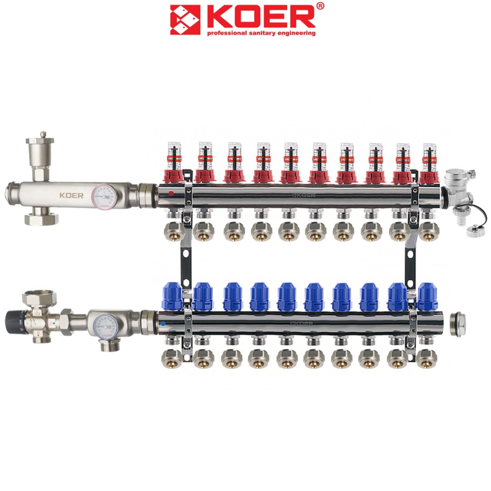 Коллекторный узел в сборе с с термостатическим смесит. клапаном для системы "ТЕПЛЫЙ ПОЛ" на 10 выходов KOER (балка - латунь,