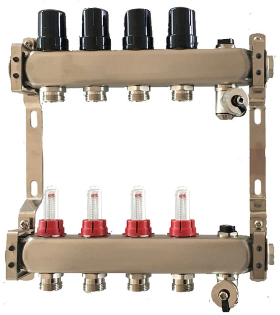Колектор на 11 контурів теплої підлоги Tervix Pro Line, нержавіюча сталь, з витратомірами, краном Маєвського та зливним клап