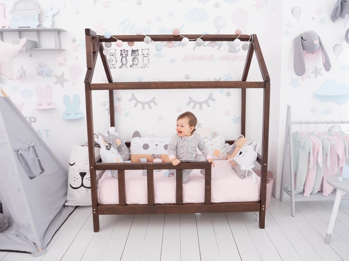 Дитяче ліжко будиночок Монтессорі BUSY WOOD на ніжках Модель 2 140х70 см темне дерево