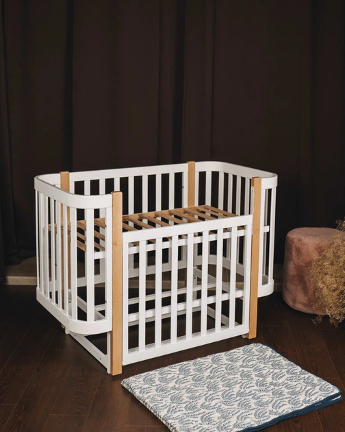 Ліжечко дитяче "мія" (1) бук, шарнір-підшипник, опускна боковина (білий+натуральна стійка)