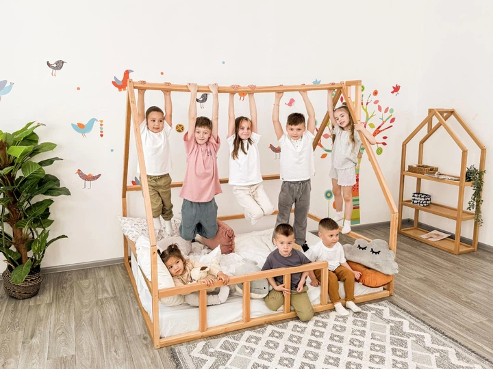 Дитяче ліжко будиночок Монтессорі BUSY WOOD на підлозі Модель 1 200х160 см натуральне дерево