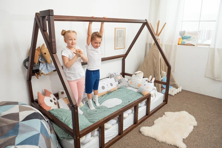 Дитяче ліжко будиночок Монтессорі BUSY WOOD на підлозі Модель 1 200х90 см темне дерево
