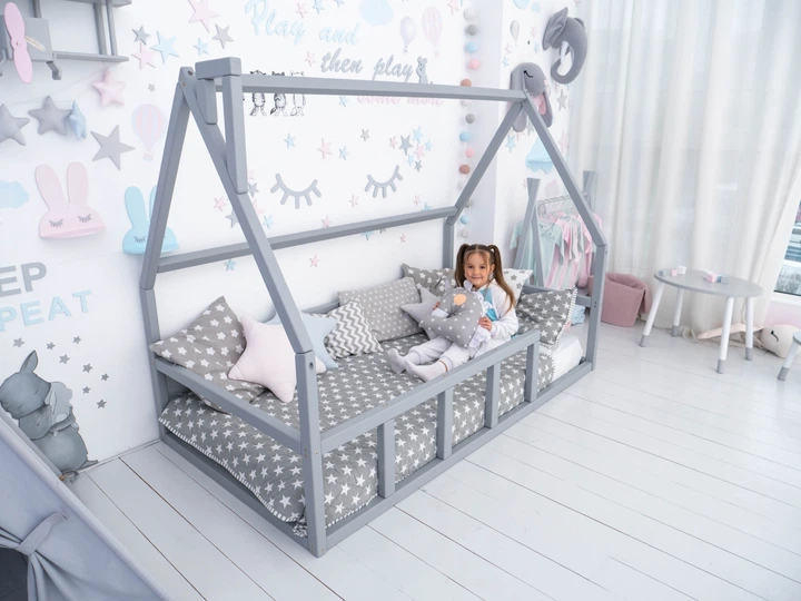 Дитяче ліжко будиночок Монтессорі BUSY WOOD на підлозі Модель 1 190х80 см сіре