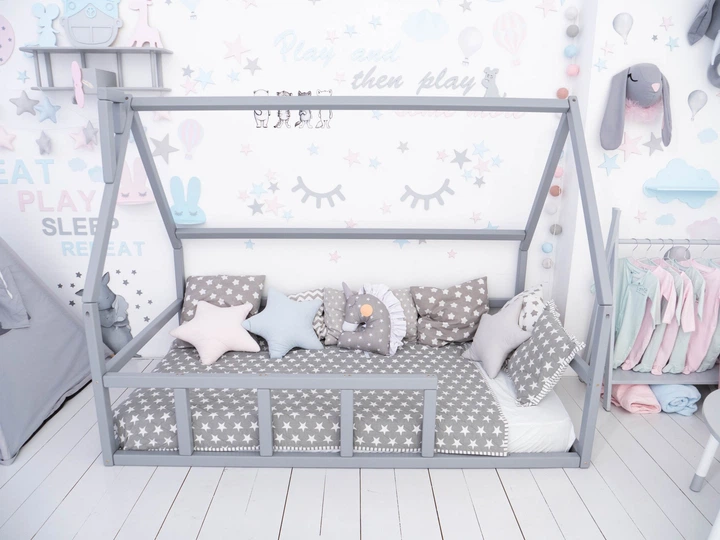 Дитяче ліжко будиночок Монтессорі BUSY WOOD на підлозі Модель 1 190х90 см сіре