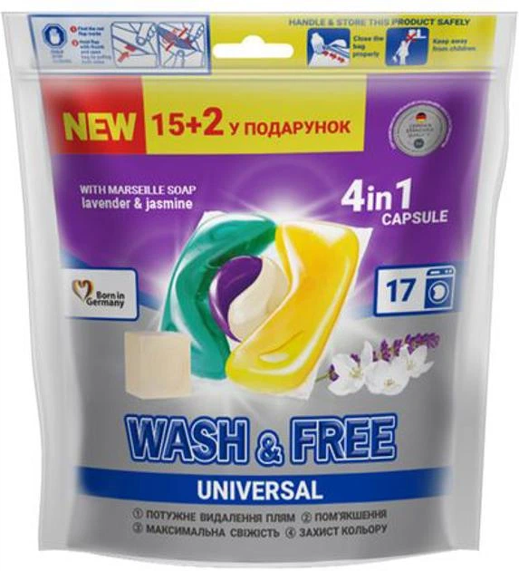 Капсули для прання Wash&Free Жасмин та лаванда з марсельським милом 15 + 2 шт
