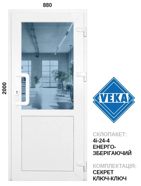 880*2000 двері вхідні металопластикові білі, праве відкривання, Veka WHS60 / 4i-24-4, VEKA