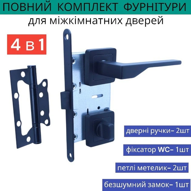 Комплект дверної ручки із замком засувкою петлями в чорному кольорі для міжкімнатних дверей TRION ZERO AL-74 MB