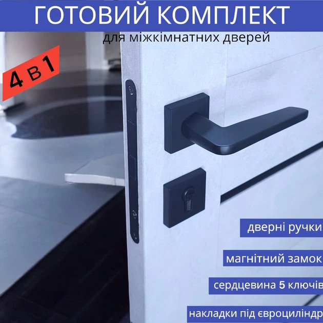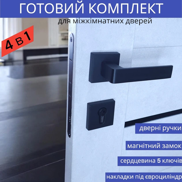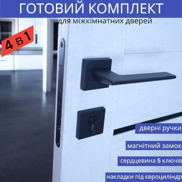 Чорна квадратна ручка для міжкімнатних дверей з магнітним замком і циліндром 5 ключів TRION GALAXY AL-49 Black