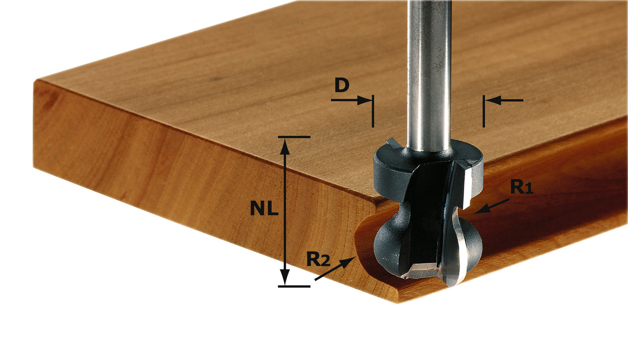 Фреза скругляюча для зняття фаски HW S8 D17.5/R6/15° з опорним підшипником хвостовик 8 мм Festool 491134 ТЕХНІЧНІ ХАРАКТЕРИСТИКИ: S, мм: 8 D, мм: 17,50 NL, мм: 19 GL, мм: 61 R, мм: 6,0 Alpha, град: 15 ОПИС: За допомогою фрези для заокруглення фасок можна фрезерувати радіус 6 мм, що переходить у кутку у фаску. Для цього використовується комбінація фрез для зняття та заокруглення фасок з конусним підшипником. Сучасні профілі торців на меблевих фасадах або стільницях мають широке поширення. За два робочі проходи можна легко обробити так звану «швейцарську крайку». Конічні опорні підшипники можна підганяти під діаметр фрези Дві твердосплавні різальні крайки забезпечують великий ресурс Швидка зміна опорного підшипника за рахунок його кріплення одним гвинтом З конічним опорним підшипником Твердосплавні різальні крайки Округлення скошених торців
