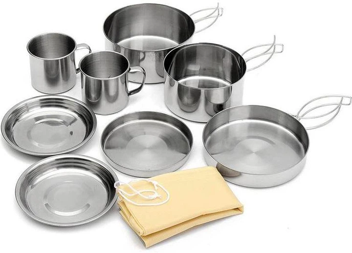 Набір металевого посуду 8 предметів для пікніка (сковороди, ковші, тарілки, кружки) 14x6,5 см, 15x3 см, 12x6,5 см, 13x1,6 см