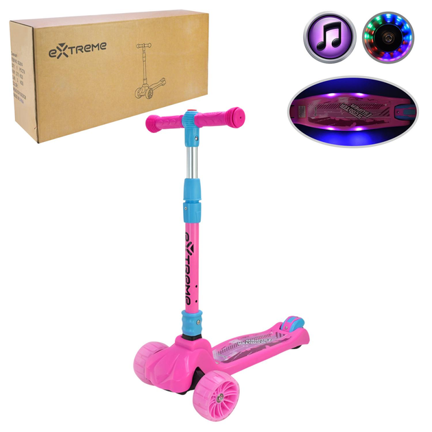 3х-колісний самокат складаний Extreme рожевий з музикою PU колеса 105мм та LED підсвічування SC814Pink