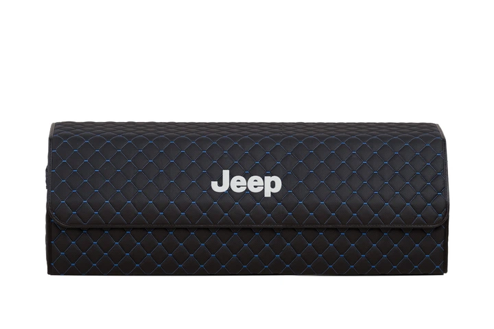 Органайзер до багажника автомобіля Jeep з перфорованої еко-шкіри 100/30/30 см чорний с синьою строчкою