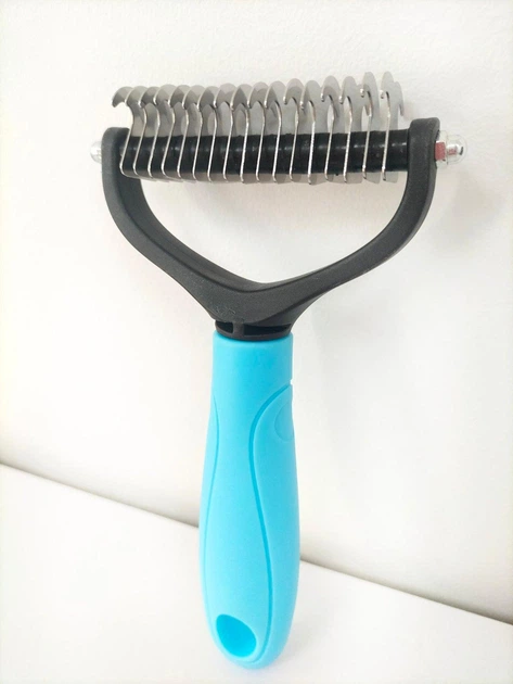 Ковтуноріз двосторонній великий для собак і котів, металеві зубці, безпечна щітка для шерсті – блакитний