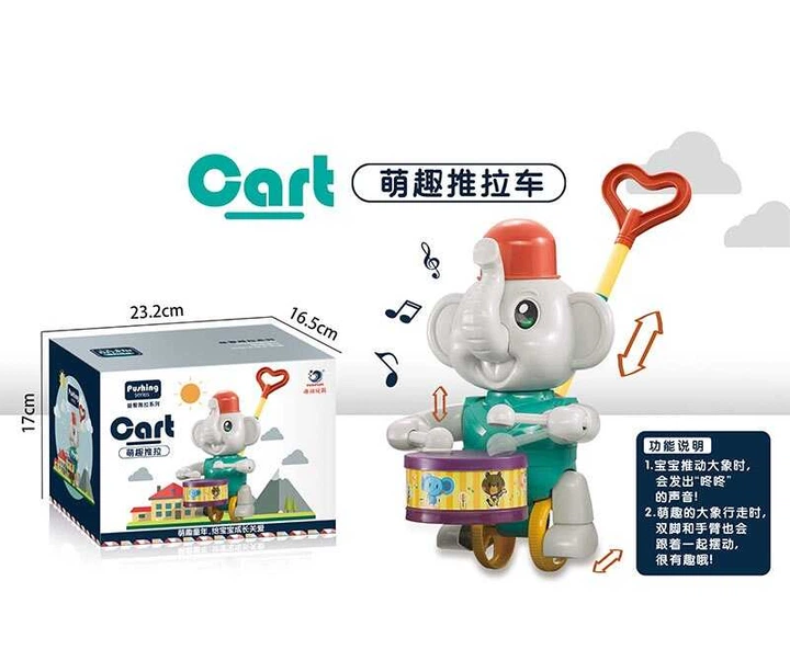 Каталка 0356-2 "Слоненя", розмір - 13х14х61 см, рухомі елементи, звук барабану, ручка, в коробці