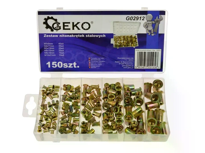 Набір різьбових заклепок-гайок Geko, сталь, М3–М10, 150 шт., у пластиковому кейсі, СРG02912