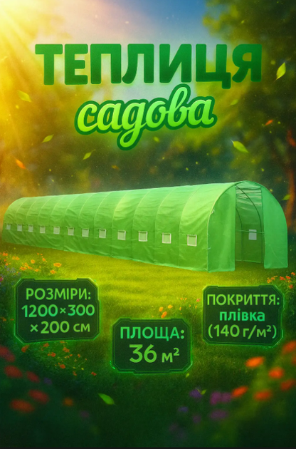 Садова теплиця 36м2 VOLSO POLSKA VS 12320 плівкова 1200*300*200см армована з вікнами