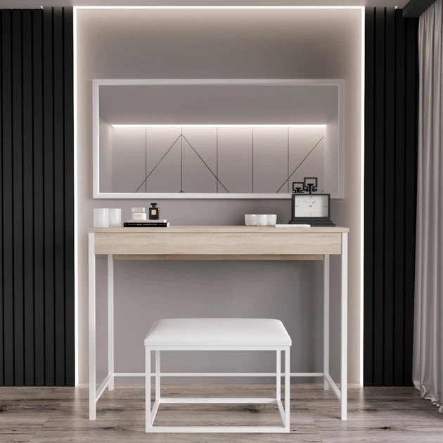 Туалетний столик з дзеркалом та банкеткою Fenster Монро Білий ДСП дуб сонома