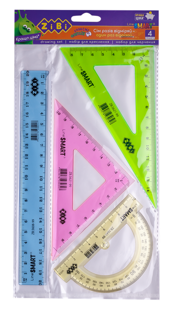 Комплект: лінійка 20см, 2 трикутники, транспортир, тоновані, SMART Line
