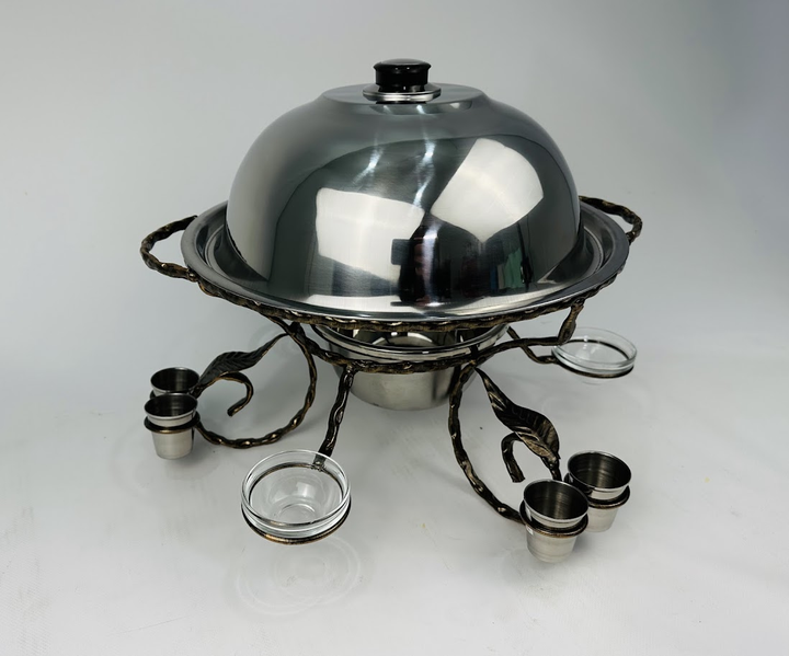 Садж з кришкою для подачі та підігріву шашлику із нержавіючої сталі 36 см на підставці з 3 соусницями та 6 чарками Сріблясти