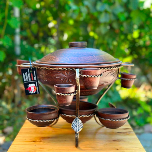 Садж блюдо для подачі шашлика Вітой з глиняним посудом Шашличниця 3,5л з соусницями та чарками