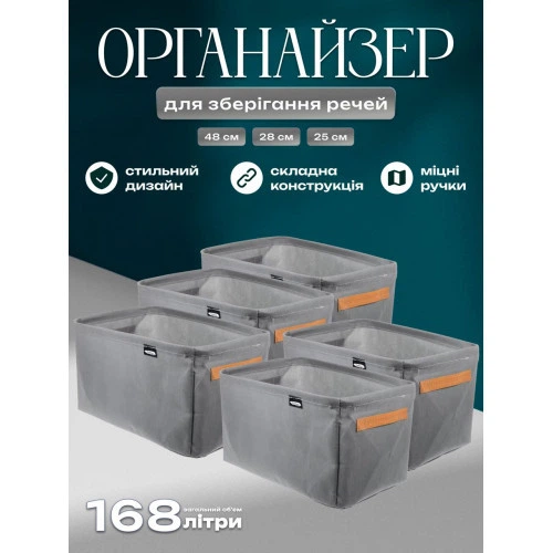 Набір Органайзерів з 5 шт 48 х 28 х 25см 33 літри для зберігання одягу, білизни, шкарпеток, краваток сірий 5138723