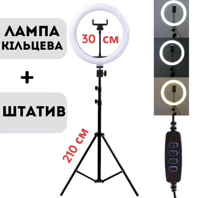 Кільцева лампа LED 30 см Ring Light Лампа для блогера та візажиста з тримачем для телефону та штативом 2,1 метра кругла 30 с