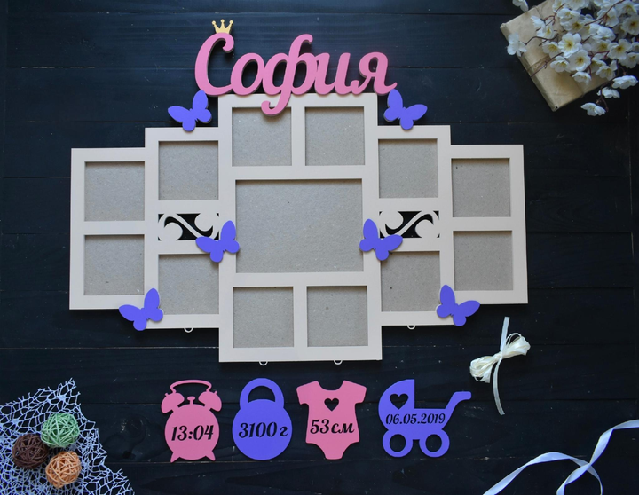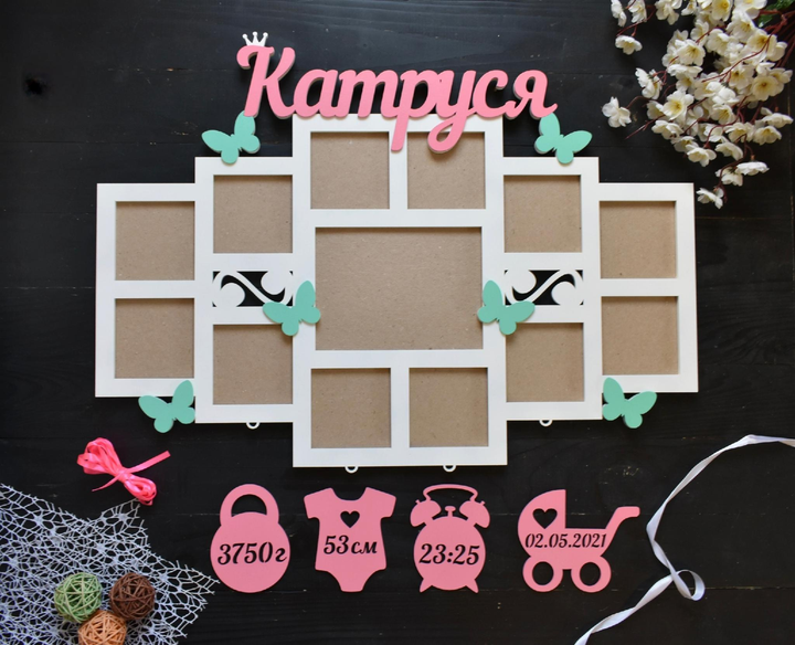 Настінна дитяча метрика для новонародженого на 13 фото на замовлення (ДГ0038-2)