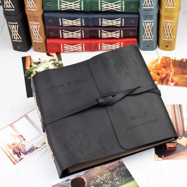 Фотоальбом шкіряний з гравіюванням на замовлення, 40 аркушів крафт, Black, Malina Leather