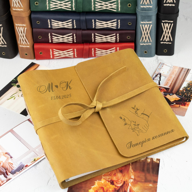 Шкіряний фотоальбом з гравіюванням ініціалів на замовлення, 40 аркушів чорних, Sand, Malina Leather