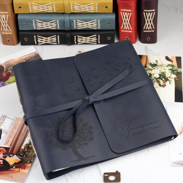 Фотоальбом шкіряний з гравіюванням на замовлення, 40 аркушів чорних, Blue, Malina Leather