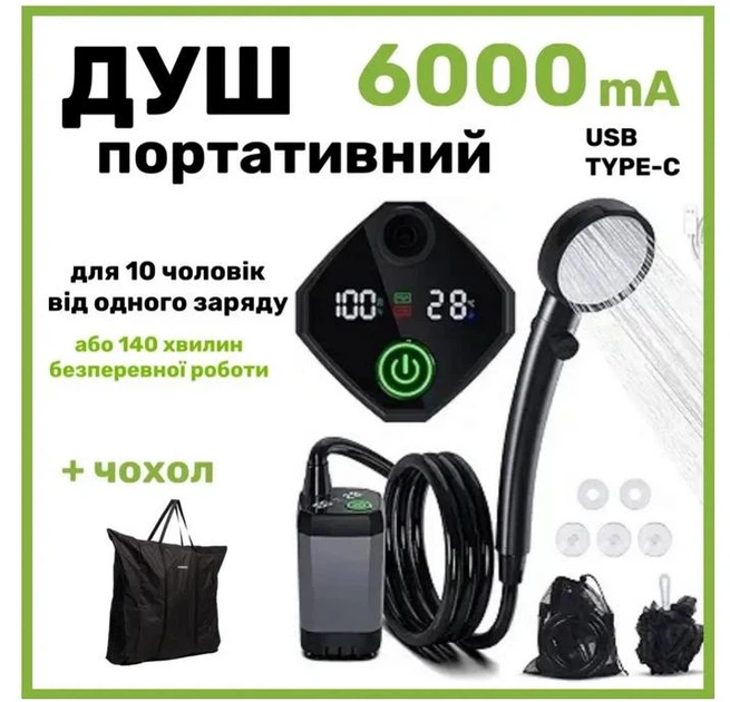 Портативний душ із насосом на акумуляторі 6000 mA із зарядкою від USB