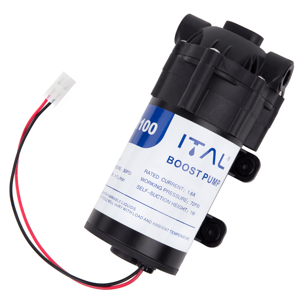 Помпа ITAL FBL-75G для фільтрів зворотного осмосу — це надійний пристрій для забезпечення стабільного тиску води у системі зворотного осмосу. Підходить для фільтрів продуктивністю до 100 галонів на день. Характеристики та переваги помпи ITAL FBL-75G - Призначення: підтримка стабільного тиску у системі зворотного осмосу. - Продуктивність: до 100 галонів на день — забезпечує